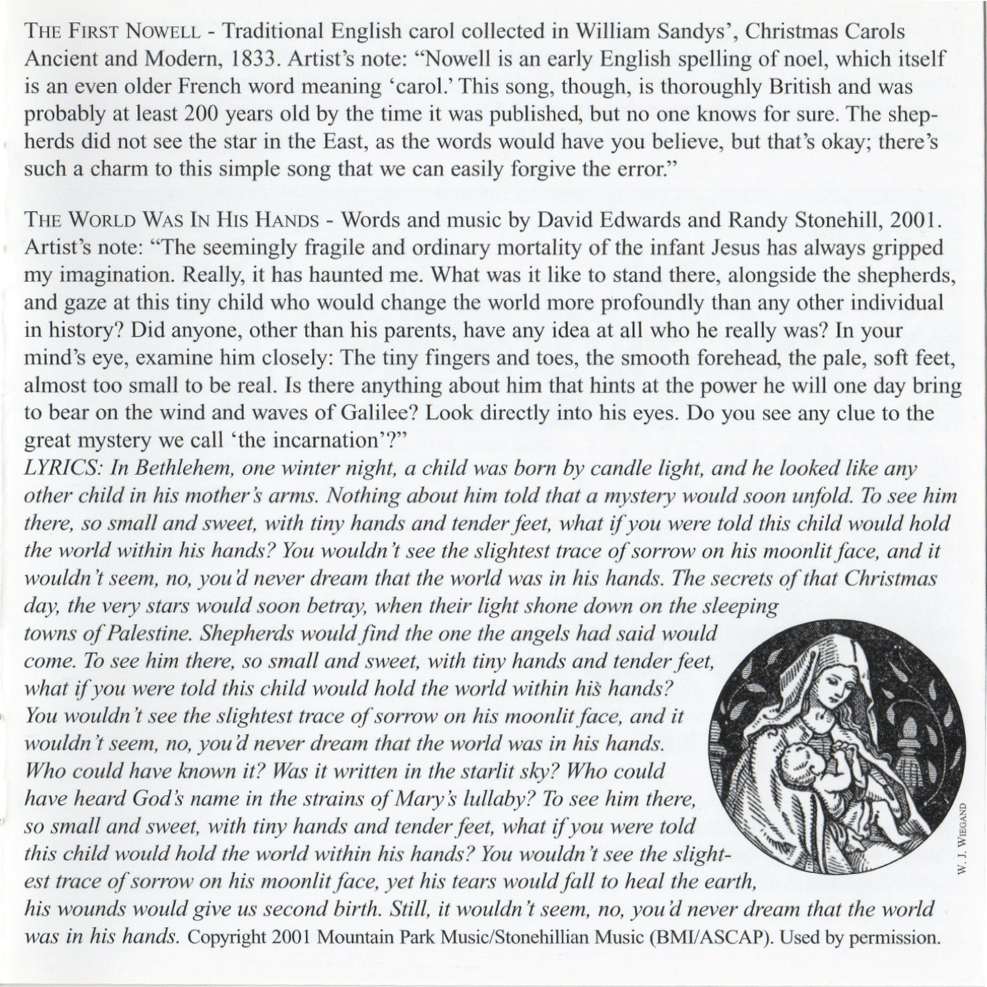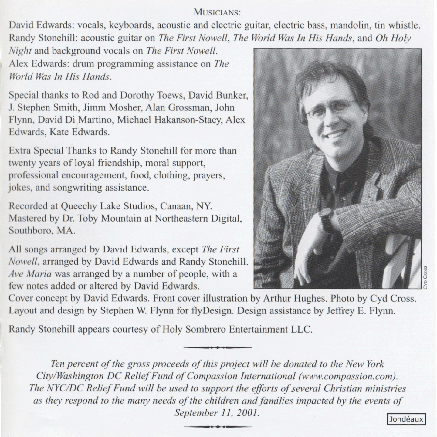 All songs arranged by David Edwards, except The First Nowell, arranged by David Edwards and Randy Stonehill. Ave Maria was arranged by a number of people, with a few notes added or altered by David Edwards.