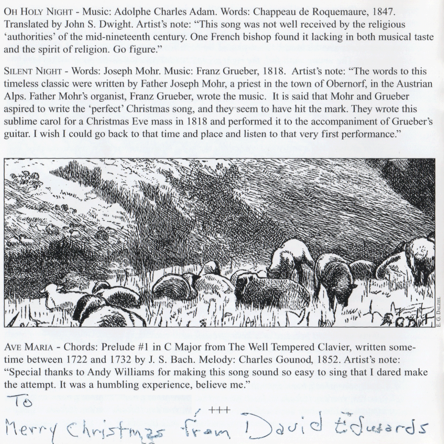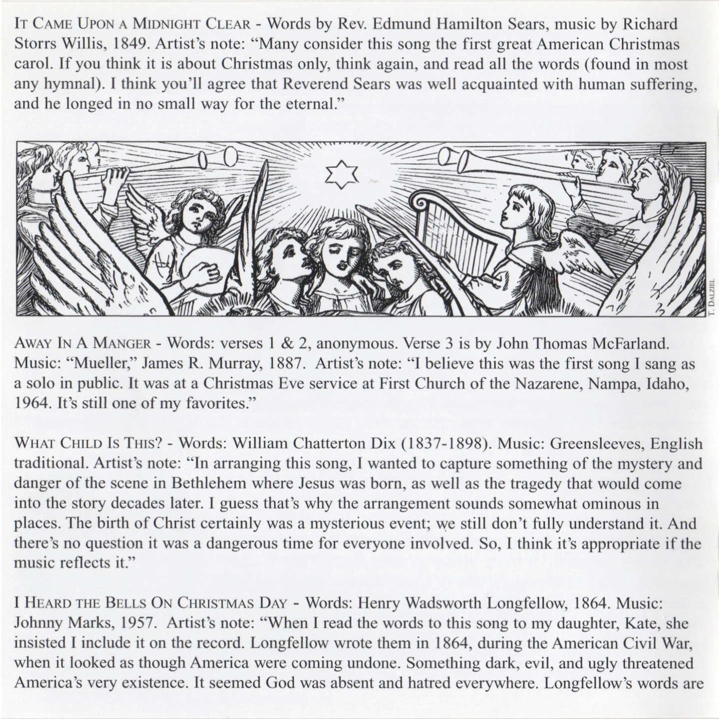 “If a gem is rare, durable, and suitable for polishing, having value and beauty that are intrinsic and not derived from its setting, then a great song must be a type of gem. As a recording songwriter, I know too well what it’s like to toil over a record for months, only to find that, all along, I was polishing the unpolishable. That’s why it was such a refreshing pleasure for me to make a record based on songs whose value and beauty have been universally recognized for decades or even centuries. I hope you enjoy these new settings of some of the most beautiful and durable gems of the classic Christmas carols. The two new Christmas songs I’ve included haven’t yet stood the test of time, but I think they’re good, and I think you’ll like them.”